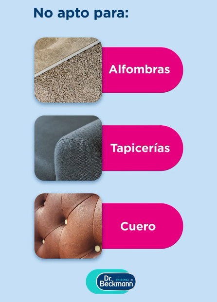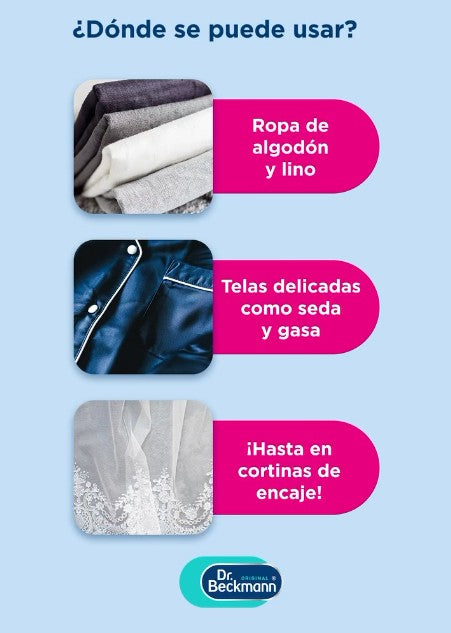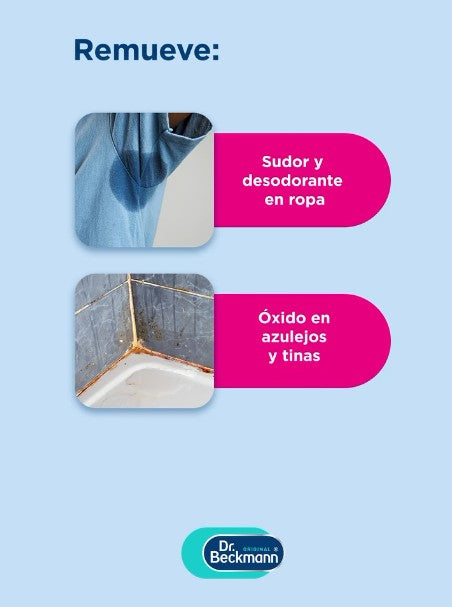 Dr. Beckmann El Mago Quitamanchas está formulado para eliminar eficazmente manchas de óxido, sudor y desodorante sin dañar los tejidos. Su fórmula reductora actúa en profundidad, restaurando el color original de la prenda.