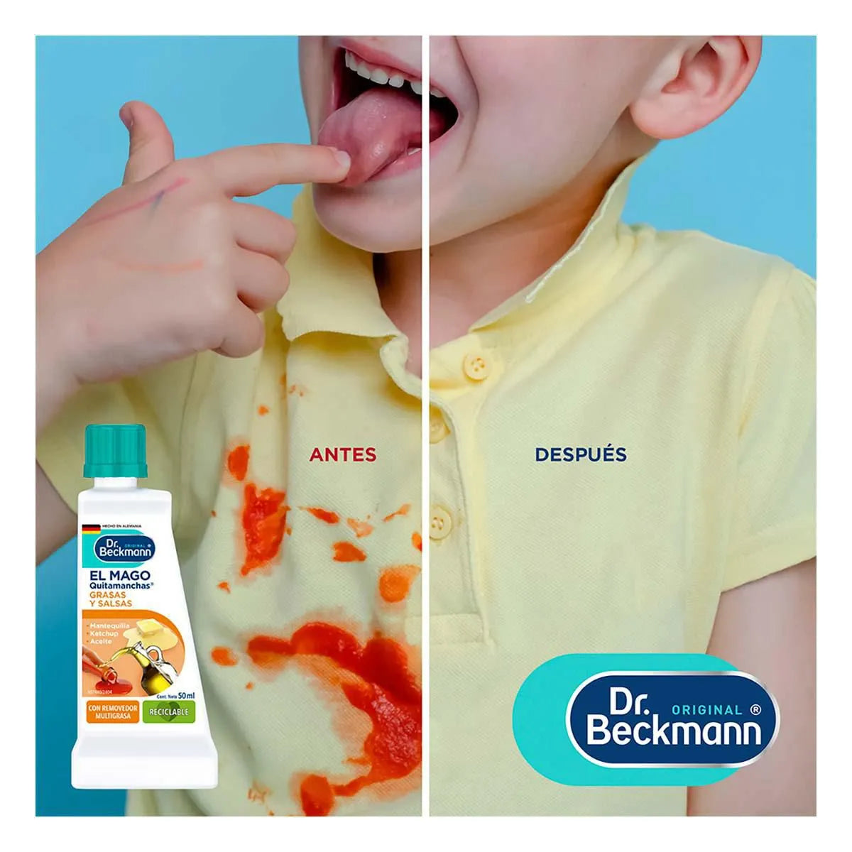 Dr. Beckmann El Mago Quitamanchas Grasas y Salsas elimina eficazmente manchas de aceite, salsas, mayonesa, chocolate, ketchup o mantequilla, cuidando las telas y los colores.