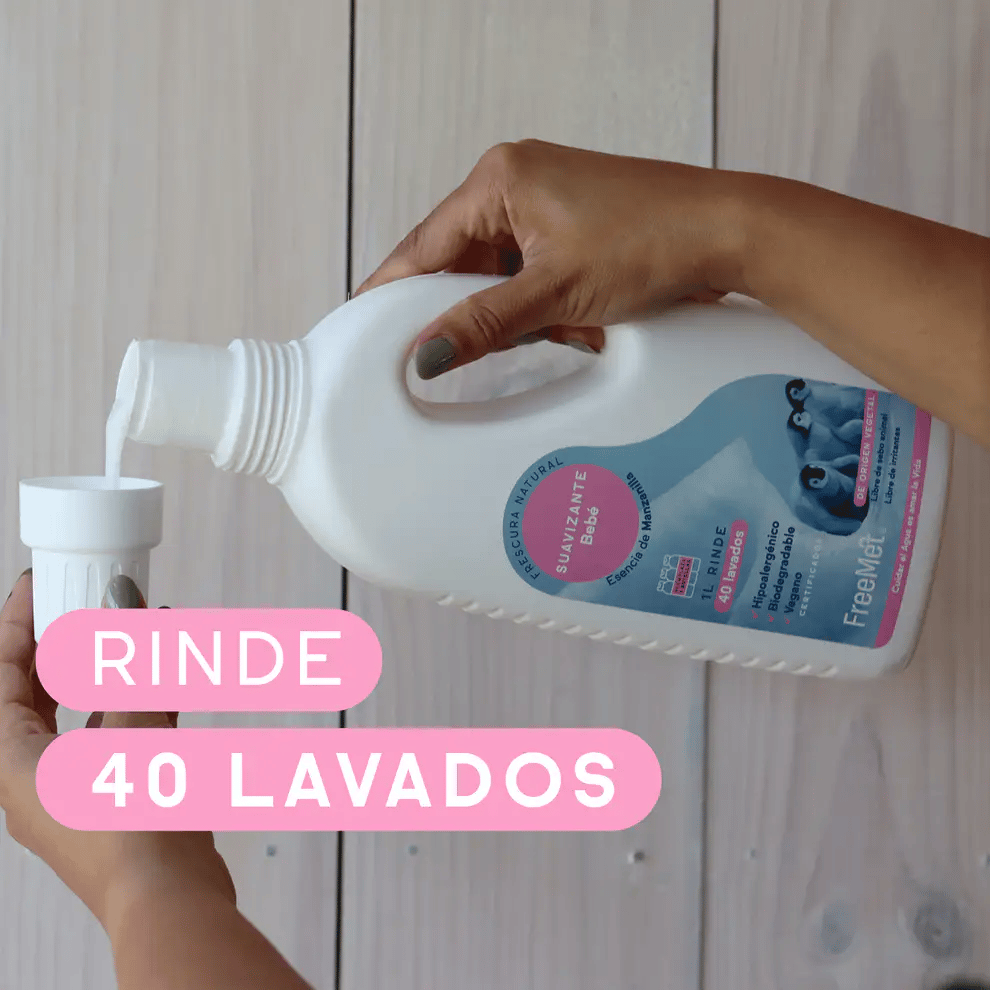 El Suavizante Freemet Bebé cuida la ropa y la piel con una fórmula vegana e hipoalergénica, ideal para prendas infantiles y pieles sensibles. Hecho a base de ingredientes vegetales biodegradables, suaviza las fibras, reduce la estática y deja una fragancia fresca y delicada de manzanilla.