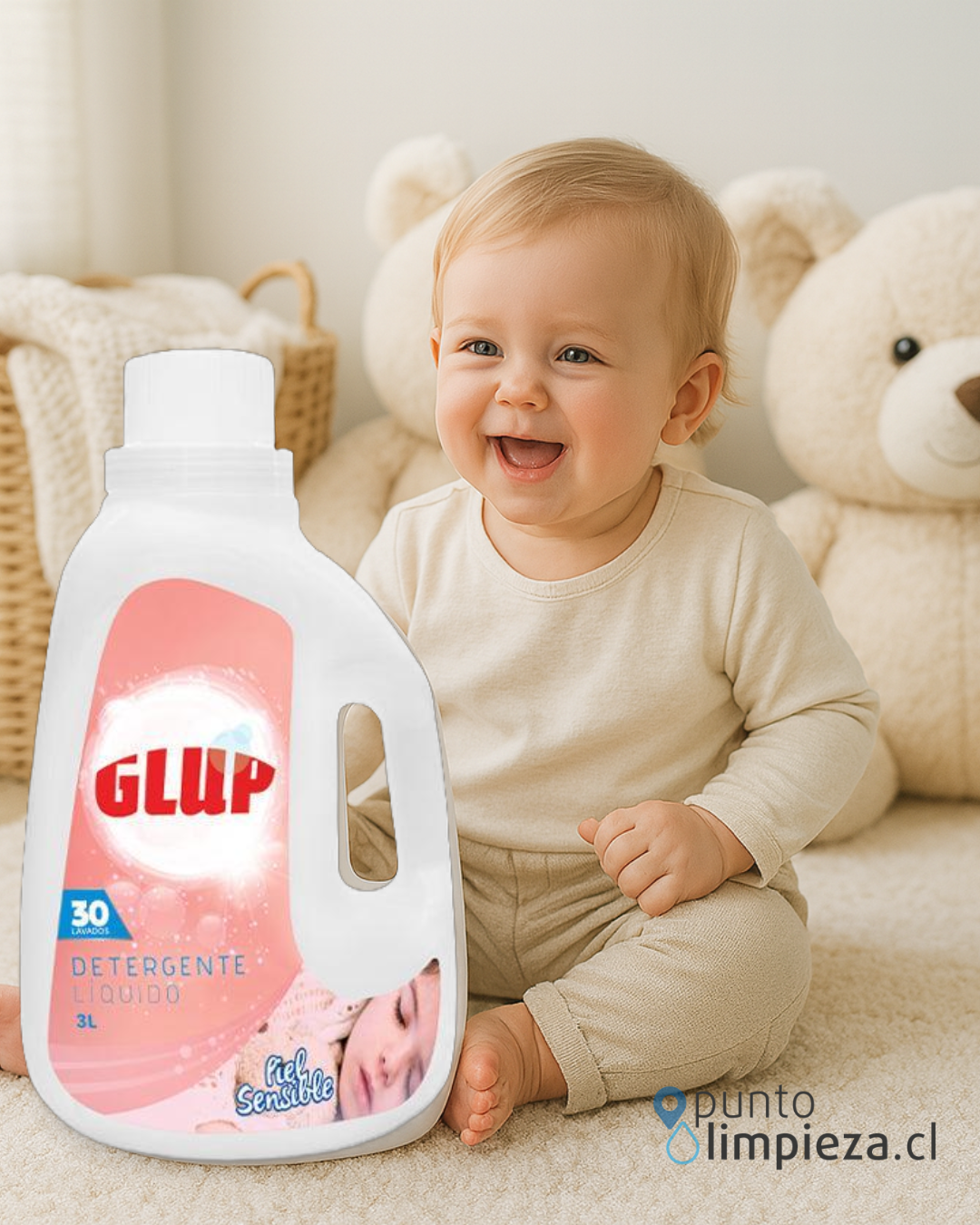 El detergente líquido Glup para piel sensible está especialmente formulado para el lavado delicado de ropa infantil, ropa a mano y prendas de personas con piel sensible o alérgicas.