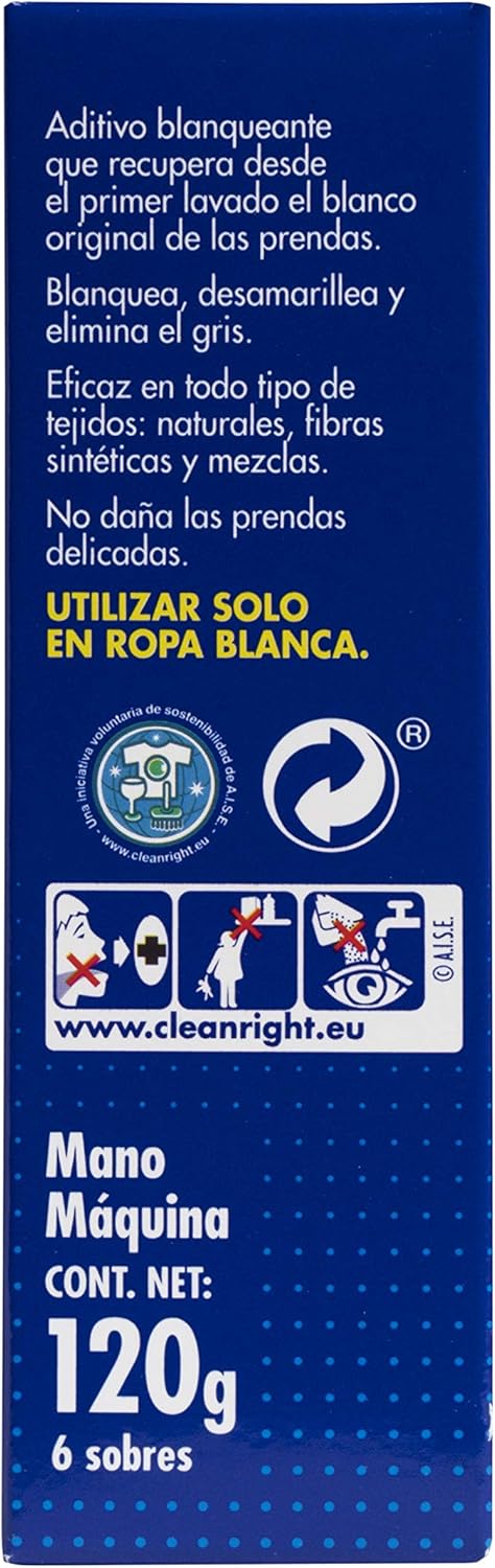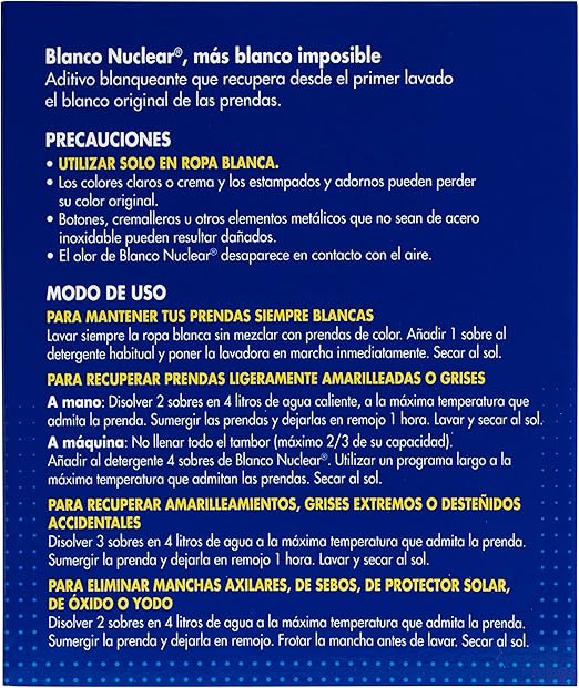 Utiliza Blanco Nuclear Sobres tan solo en ropa blanca: los colores claros o crema, los estampados y otros adornos pueden perder su color original. Para recuperar amarilleamientos y grises extremos realiza el tratamiento a mano, en agua muy caliente. No te preocupes por su olor intenso: desaparece en contacto con el aire.