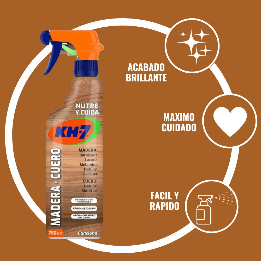 KH7 Madera y cuero, contiene ceras de origen natural que nutren sin engrasar ni alterar el color y brillo natural de la madera y el cuero.