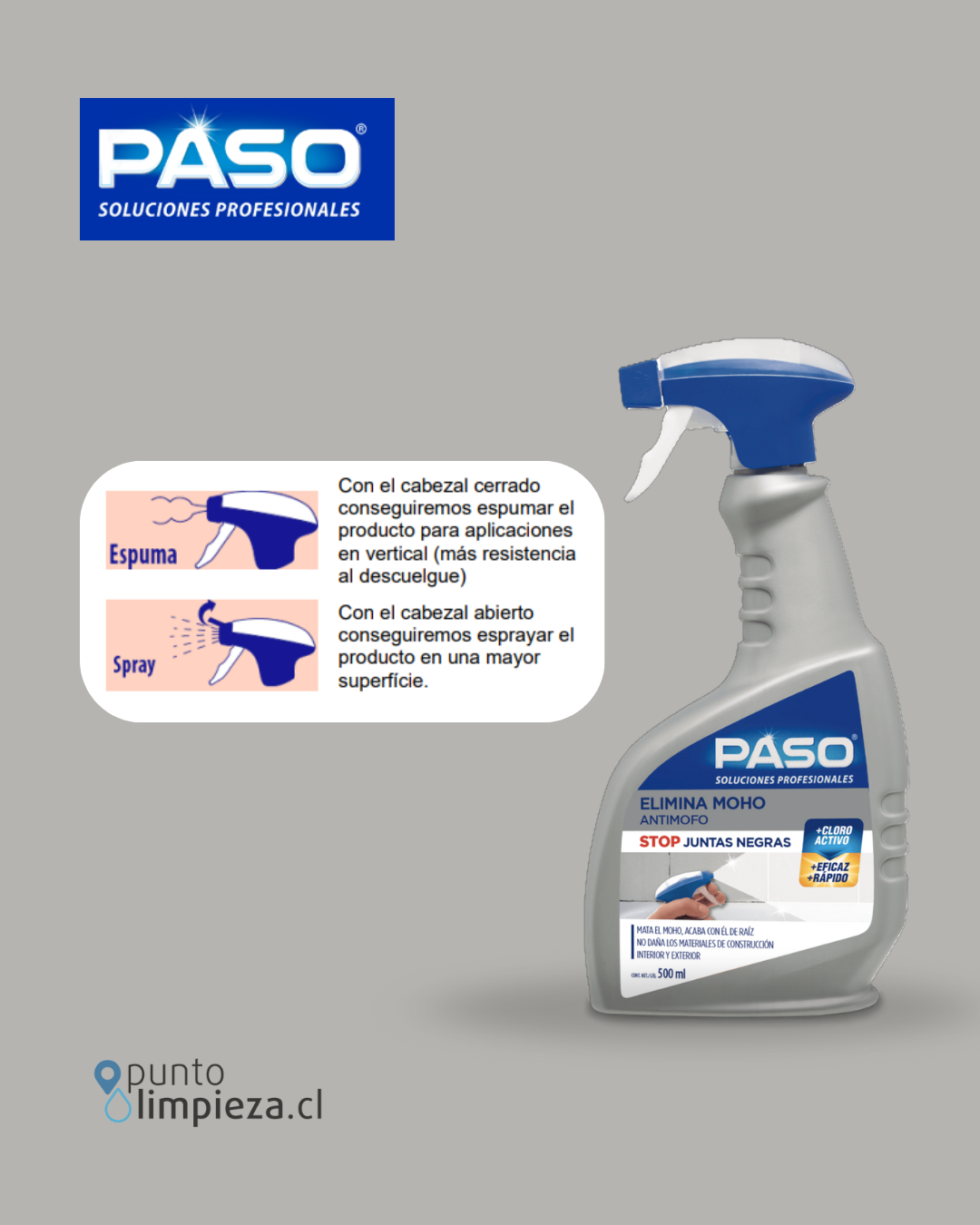 Paso Limpiador de Moho es la solución eficaz para eliminar de raíz manchas de moho, hongos, algas y musgo provocados por la humedad. Su fórmula actúa en profundidad, retrasa la reaparición y ofrece una protección duradera a las superficies tratadas.
