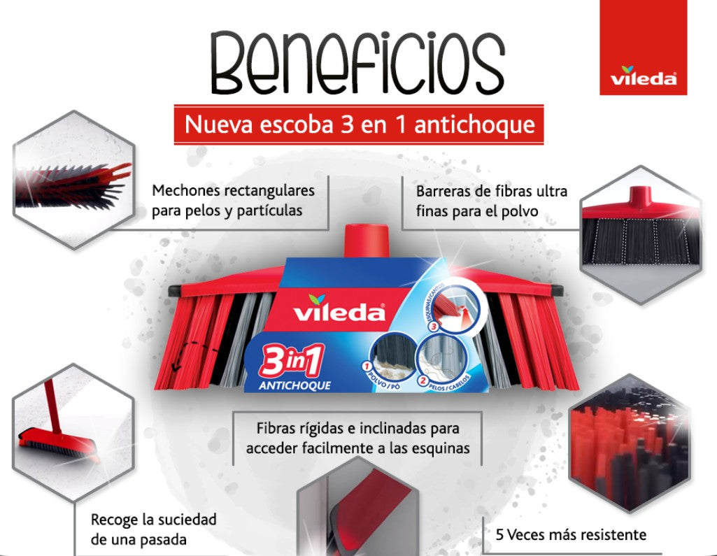 El Vileda Escobillón Antichoque 3 en 1 combina tres tipos de fibras modernas que hacen que barrer sea más rápido, fácil y efectivo.